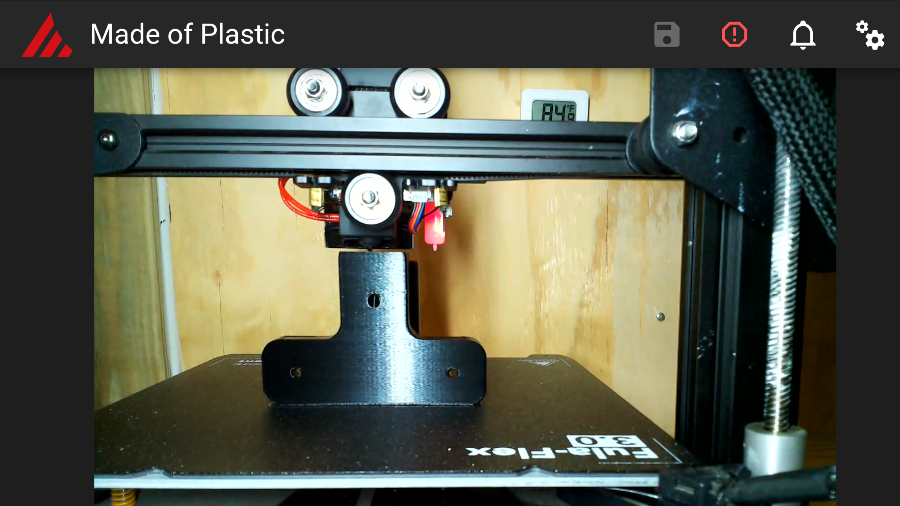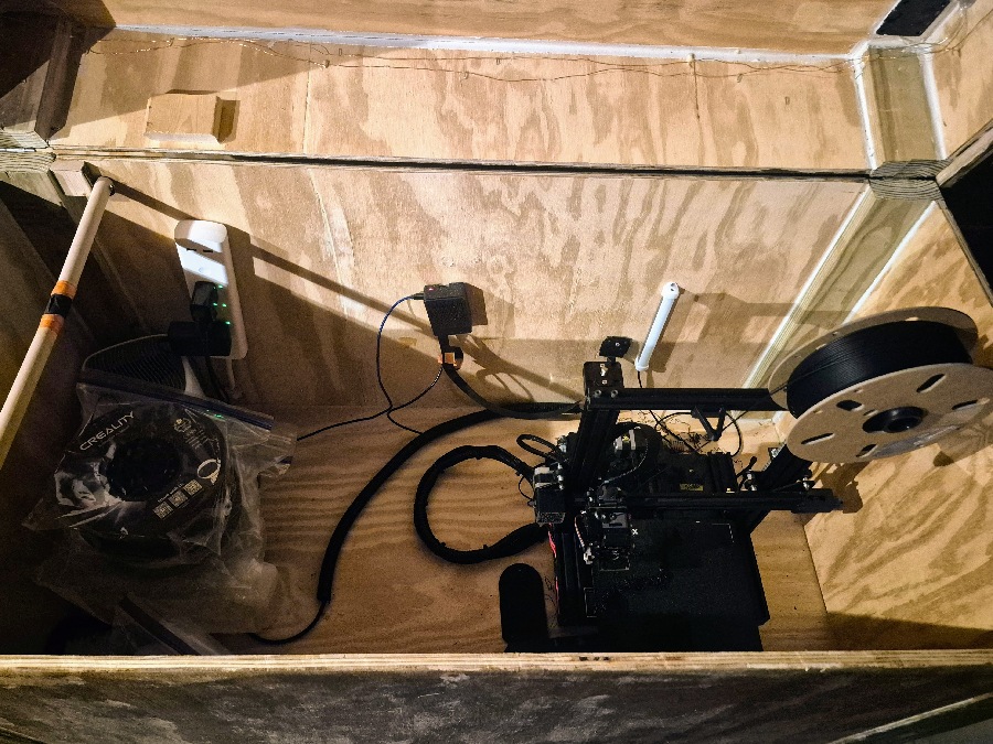 A camera is mounted inside so I can observe prints without opening it! Strategically placed thermostat shows temperature and humidity.