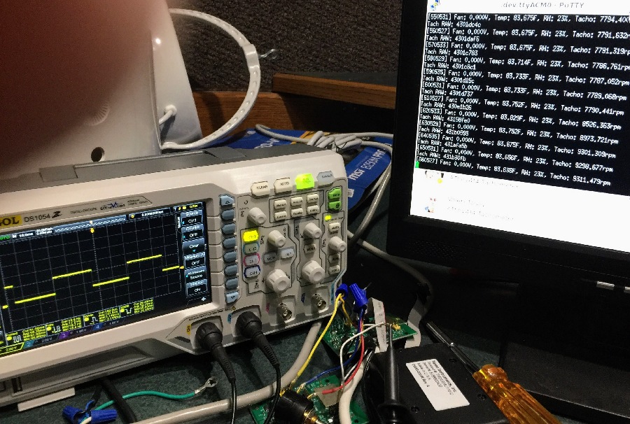 Reading outputs from the control board on an oscilliscope while watching the serial logs.