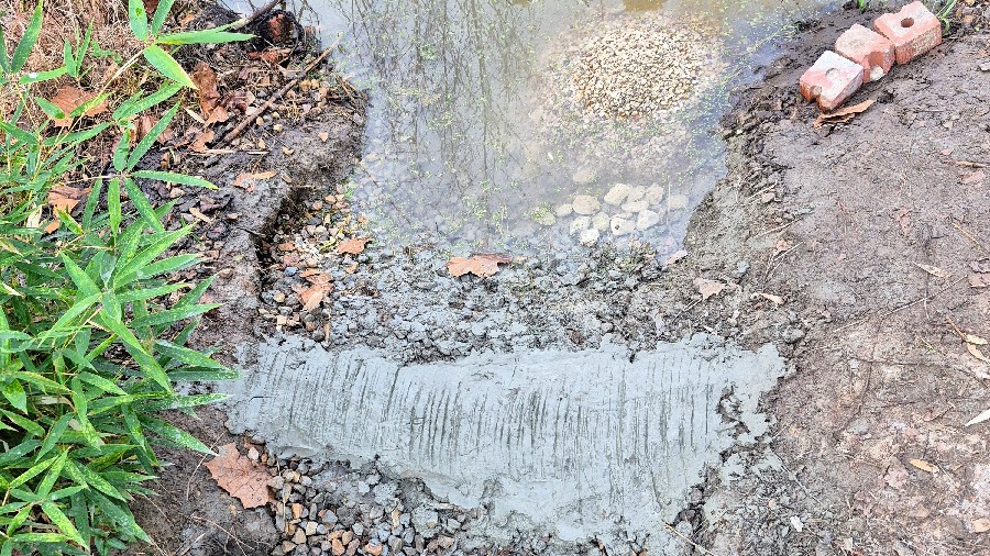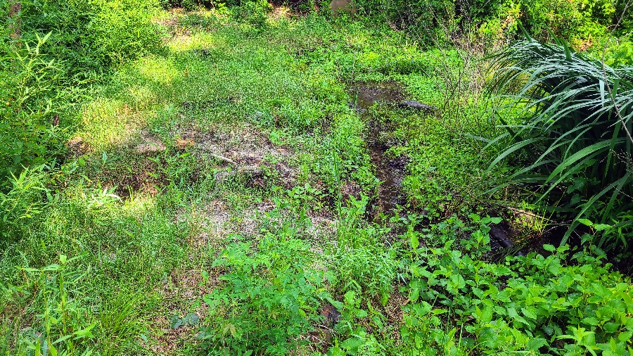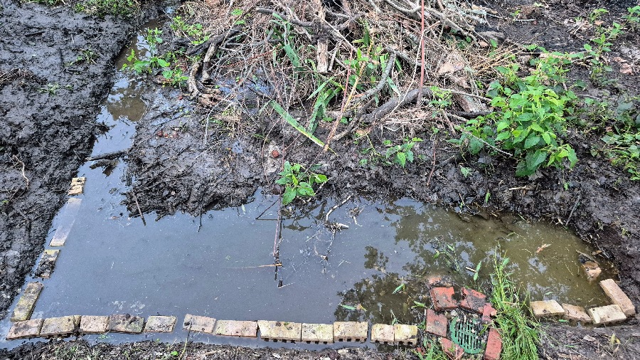 Since it's close to the pond, we can drain the water there. We do NOT want to drain sediment along with it - dredging a pond is expensive. Let's start by cleaning up the edges and adding a drain.