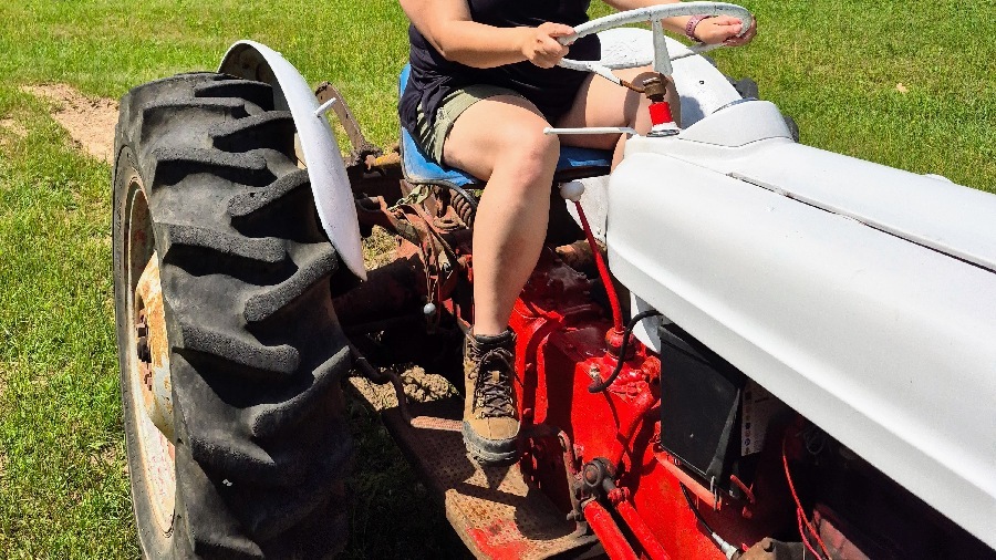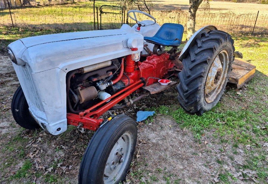 The hood badge identifies it as a 1954 Ford NAA. Faded paint on the side suggests it was owned by a landscaping company.